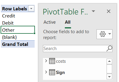 Why did this return the wrong result? The cause is because the left Pivot is asking for data from the Lookup Table (Sign) and from the transaction table (Transaction Type). In Power Pivot, Lookup Tables can see in to Data Tables, but Data Tables can't see in to Lookup Tables. Regardless of the rows field, the relationship flows down from the Sign Table to the Costs Table.